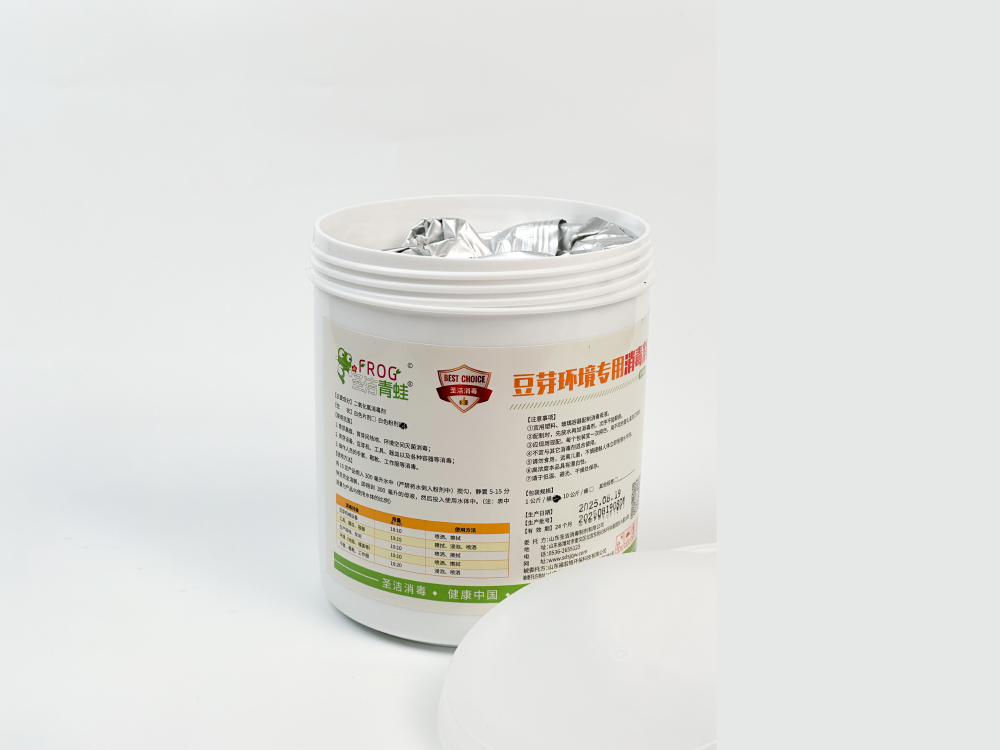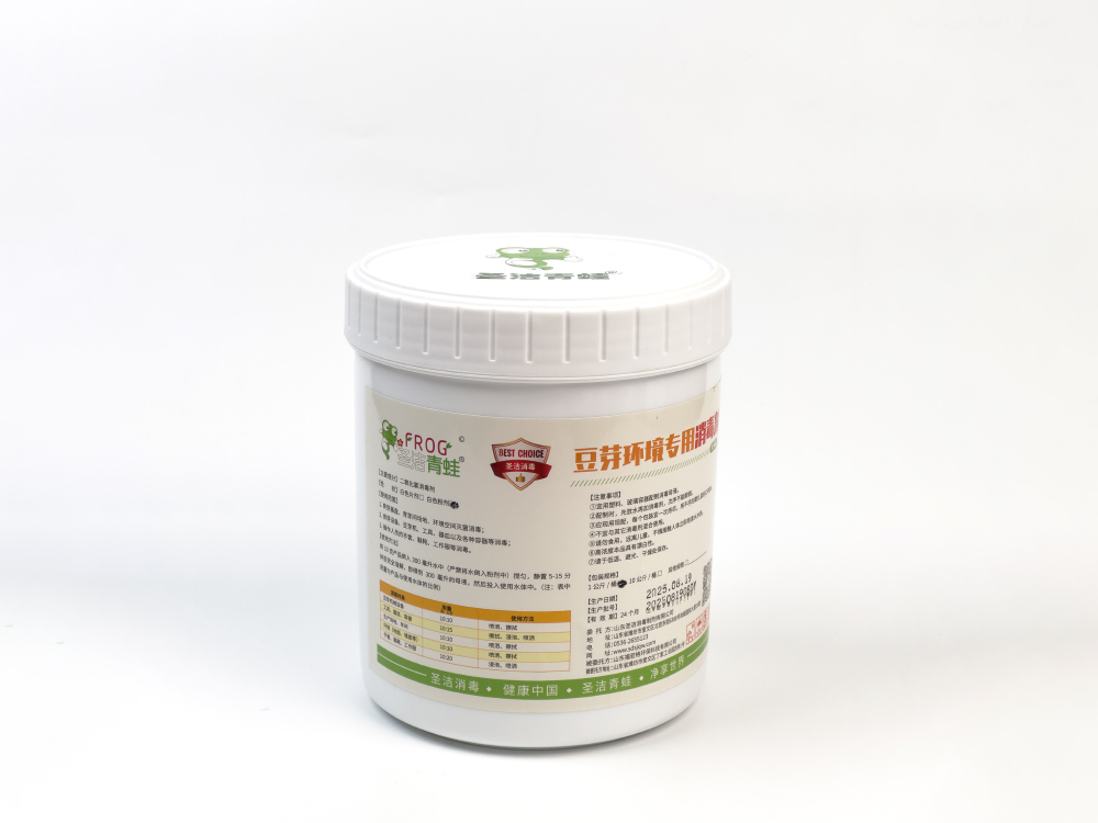圣洁青蛙豆芽环境专用消毒剂,通过强氧化作用达到消杀效果,具有广谱杀菌速度快的优势,使用浓度仅为常见含氯消毒剂(84、漂白粉、二氯等)的一半,本产品不会产生消毒副产物,属于高水平氧化性消毒剂,使用后无需再次冲洗。